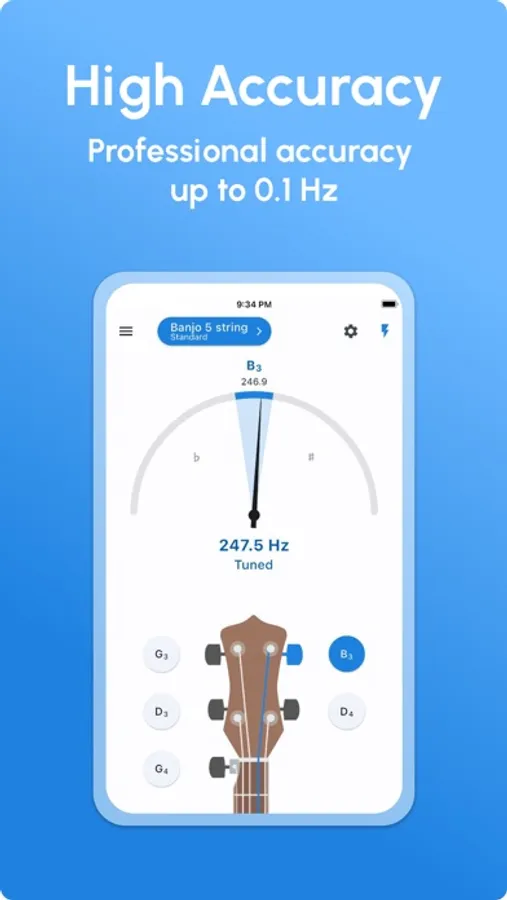 We created a unique algorithm designed for the banjo to achieve the best quality of banjo tuning. Because of this, our banjo tuner allows you to tune with very high professional precision. You'll get rich and accurate tones.