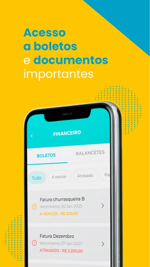 Visualiza e paga boletos. Prestação de contas mensalmente.