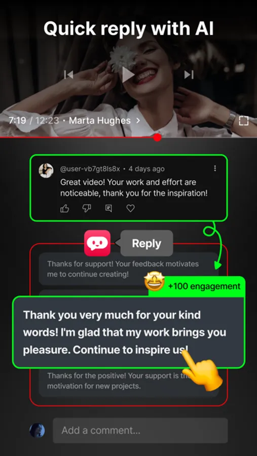 Streamline your YouTube engagement with Digital U, your ultimate comment management companion. Our app seamlessly connects to your YouTube account, making it effortless to stay on top of your audience's comments. Say goodbye to the guesswork and hello to AI-powered comment suggestions. With Digital U, you'll receive intelligent recommendations for responding to user comments, ensuring your engagement is always on point. Spend less time sifting through comments and more time building meaningful connections with your viewers.