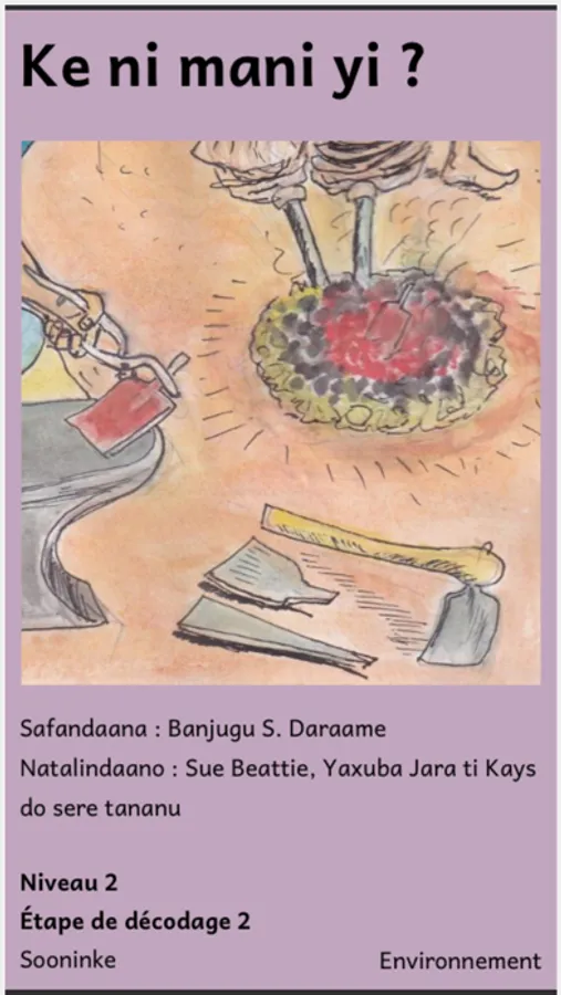 Savez-vous que dans les pays soninkés, on trouve des forgerons et beaucoup d’arbres. Donc, à travers l’application « Sooninkara », découvrez comment un Soninké accueille un étranger chez lui. Une appli composée de cinq livres de lecture pour plaisir en version illustrés, à écouter en version audio et à traduire dans d’autres langues. Découvrez aussi quelques activités physiques des enseignantes chez leurs apprenants. Et l’importance des arbres dans la société soninké. Alors, profitez de cette application pour apprendre un peu sur la culture soninké ainsi que la vie en famille. Passez un bon moment avec vos enfants à l’écoute de ces livres contenant belles images de Soninkara. Apprendre le sooninke » est une application qui aide votre enfant à apprendre à lire et à écrire en langue soninké. À travers cette appli, votre enfant va apprendre l’alphabet, les noms des différentes parties de la tête, les noms des animaux domestiques et des légumes. Votre enfant va aussi apprendre les expressions de joie, de tristesse, et beaucoup d’autres belles choses. Huit livres de lecture pour plaisir en version illustrés, à écouter en version audio et à traduire dans d’autres langues. Ce sont des livres avec des mots et phrases courts, simples et facile à lire. Des livres image-mot et image-phrase. Ils sont faits pour les enfants âgés de 4 à 8 ans. Une appli avec des quiz pour tester le niveau de connaissance de votre enfant. Profitez donc de cette application éducative pour passer un excellent moment avec votre enfant. Les livres ont été créés par SIL Mali pour le projet LiNEMA (Livres numériques pour nos enfants au Mali), un projet de Lecture Pour Tous.