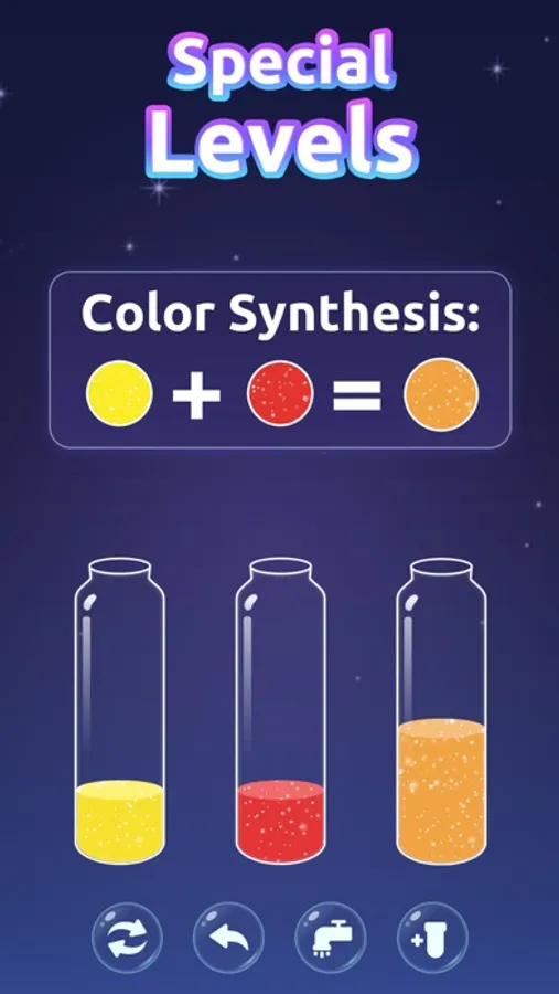 • Special Levels: Brain-training puzzles with hidden top water colors (Question Mark levels) and color synthesis challenges (Synthesis levels).