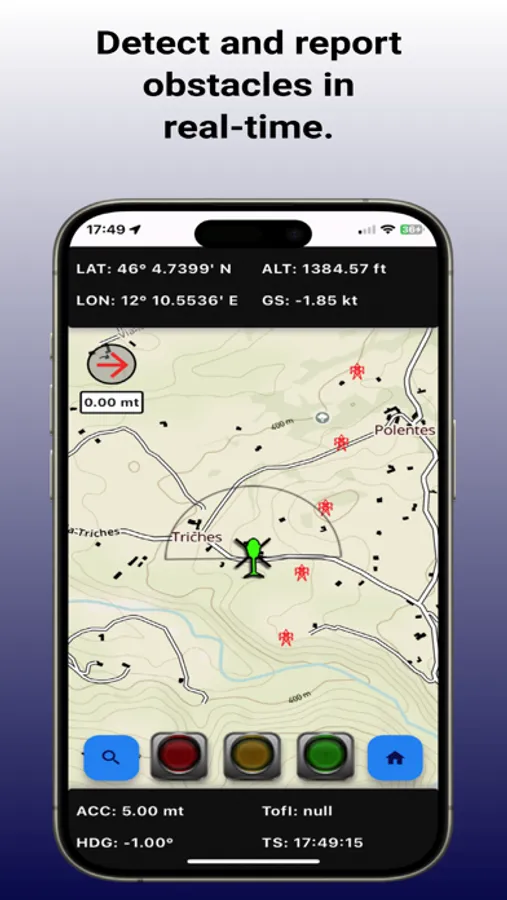 FlySafe! detects hazards such as cables, masts, antennas, or any obstacles that may pose a danger to the crew and aircraft, providing both acoustic and visual warnings. The constantly updated database contains thousands of obstacles, currently available for Italy and Switzerland. The app uses acoustic and visual signals to indicate the time to impact, calculated based on the distance to the obstacle and the aircraft's speed: