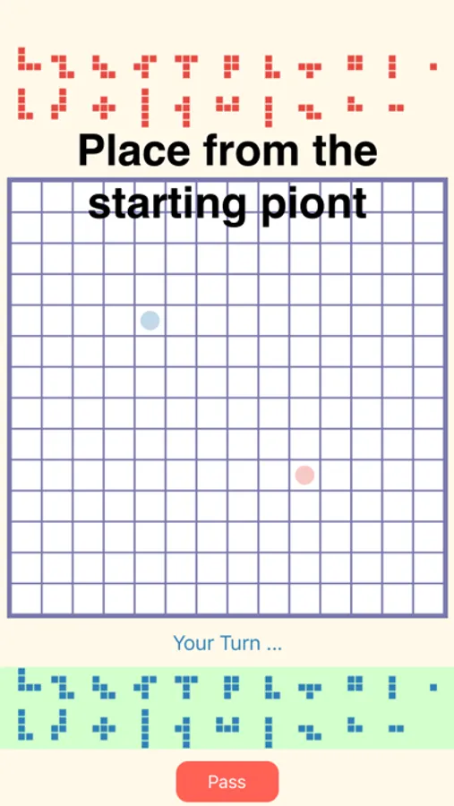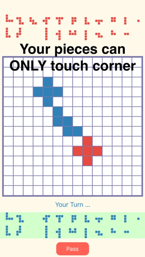 2. For the first piece, you need to touch the starting point of your color on the board; For later pieces, you need to connect with previous piece ONLY with corners, no edge touch!