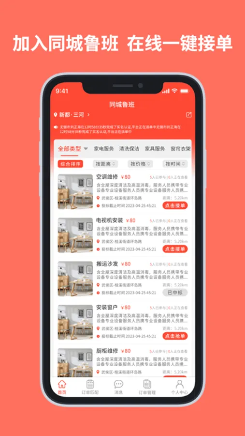 同城鲁班师傅端专注于家居建材及生活综合服务,为安装维修师傅提供接单抢单的平台。是师傅出售技能的综合服务,平台聚合了全国数千万服务需求,师傅随时随地即可实现服务交易,为用户提供上门安装,上门维修,管道疏通,家电清洗,家庭保洁等居家生活便民服务,凭着专业、优质的服务得到用户一致好评。