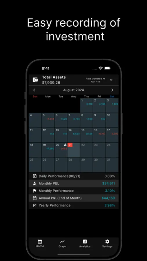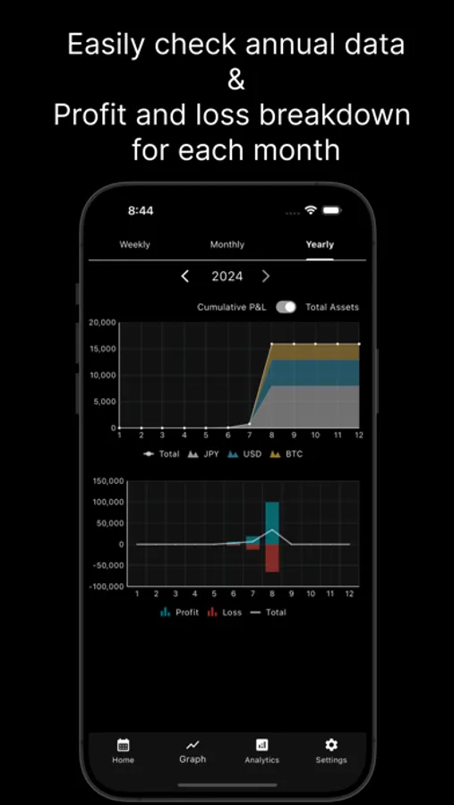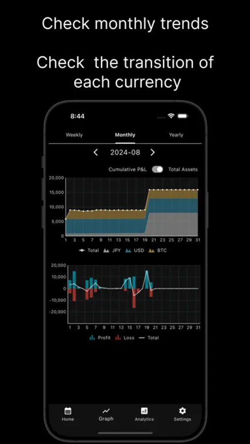 You can visually analyze income and expenses with weekly cumulative profit and loss charts, monthly cumulative profit and loss charts, total asset trend charts, and daily profit and loss bar charts.