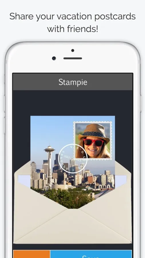Stampie is a unique and fun app to create one of a kind selfie postcards. Just take a picture of something beautiful. Stampie then takes a picture of your smiling face with the front-facing camera, and makes a postage stamp out of that picture! It will even "stamp" your postcard with the name of your city and the today's date!