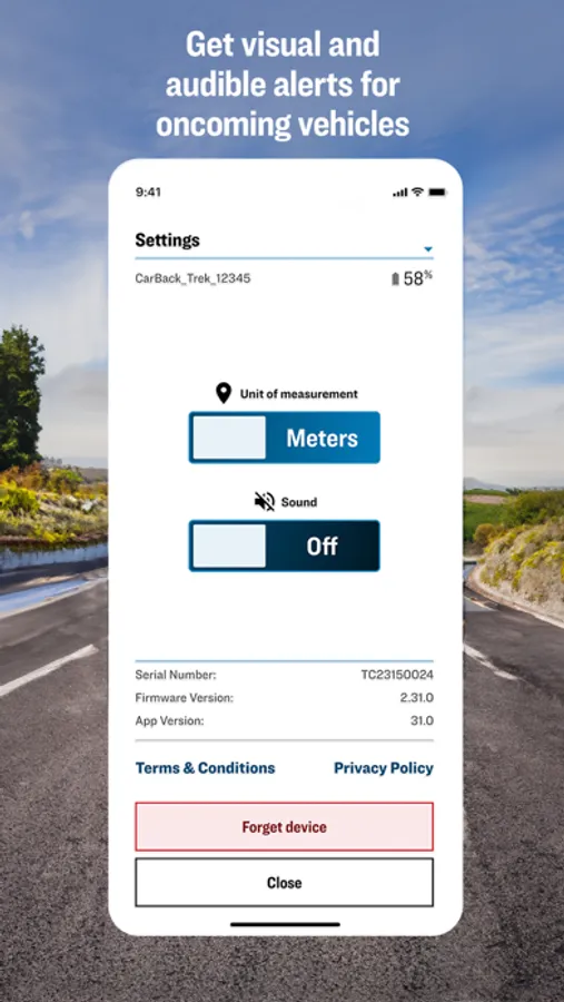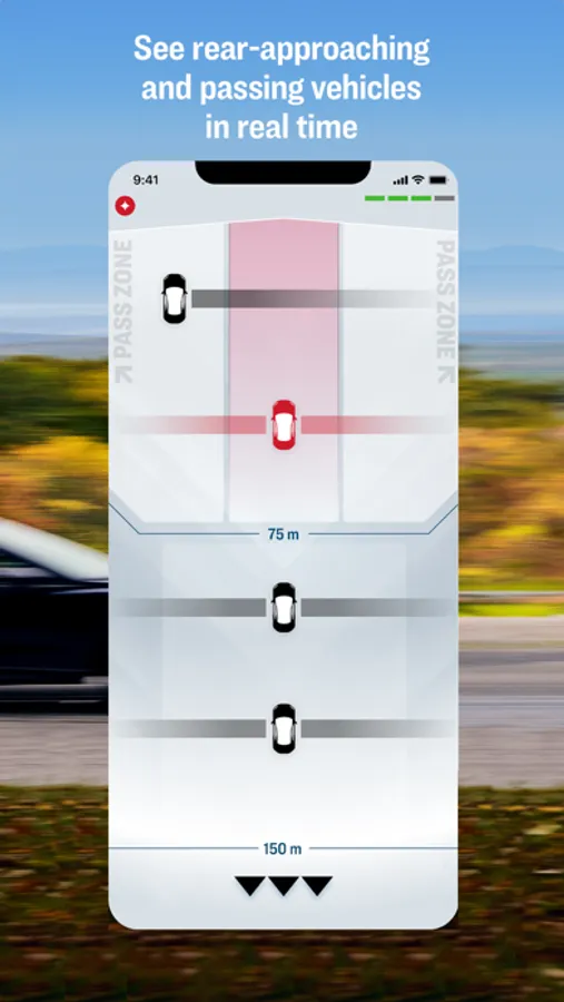 Use the Trek Accessories App to receive visual and audible alerts of detected rear approaching vehicles. The Trek Accessories App and Trek CarBack Radar can detect rear approaching vehicles from up to 240M, with vehicles first appearing with an audible beep and a visual indicator at the bottom of the App screen. Once the detected vehicle approaches to within 150M, the vehicle is shown on screen in real time. Once within 75M the Vehicles location is depicted in both distance behind and distance to either side, indicating preparation for a potential pass. Once the vehicle completes a pass, an audible alert indicates the pass and the vehicle drops off the screen.