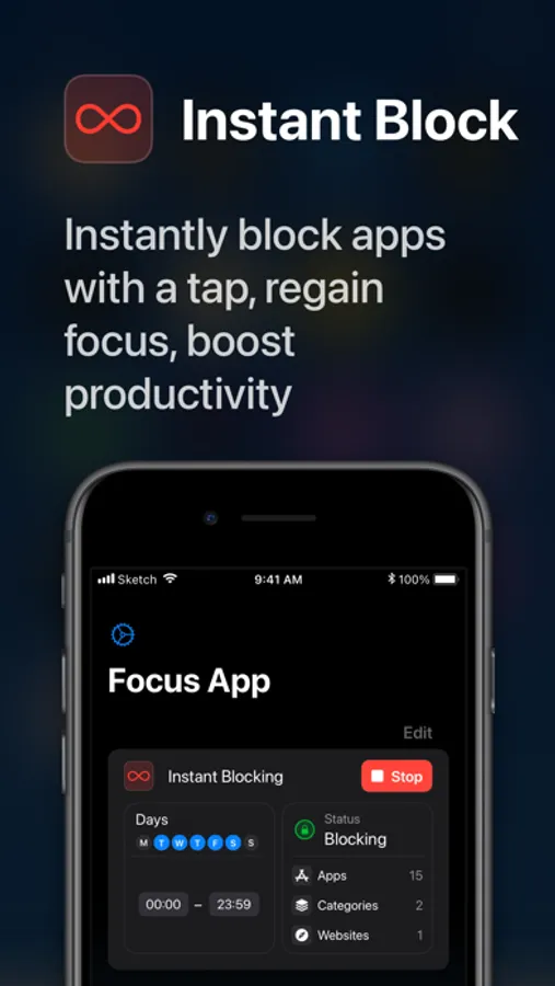 Instant Blocking: Tackle entire categories of apps with a single tap. Block all social media or gaming apps with ease, ensuring that you stay on track without wasting valuable time.