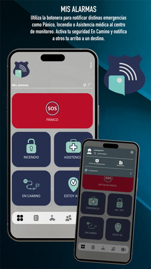- Botones de pánico policial, bomberos y médico, con envío de posición geográfica, sonido e imágenes de tu emergencia (MIS ALARMAS)