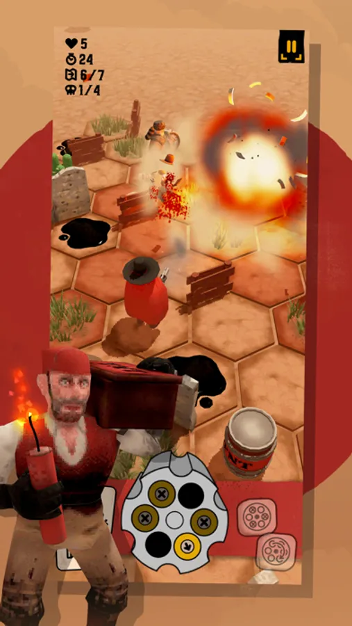 Guncho's gameplay revolves around a unique positional shooting mechanic. By moving, shooting, and unloading bullets, you influence Guncho's revolver rotation. To outwit your enemies, align your bullets through clever tactical moves. You can also use the environment to overcome the challenges of each level, by targeting explosive barrels or pushing your foes into fire or deadly cacti. After each level, choose from a variety of bullet upgrades and skills to further improve your tactical abilities. In each run, you face a final boss that will test your skills and tactical finesse.
