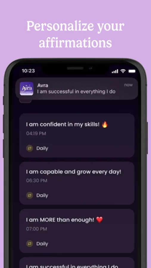 Customize the time and frequency of affirmations to seamlessly integrate with your daily schedule. With Avra, your affirmations are always at your fingertips, providing the support you need, when you need it most.