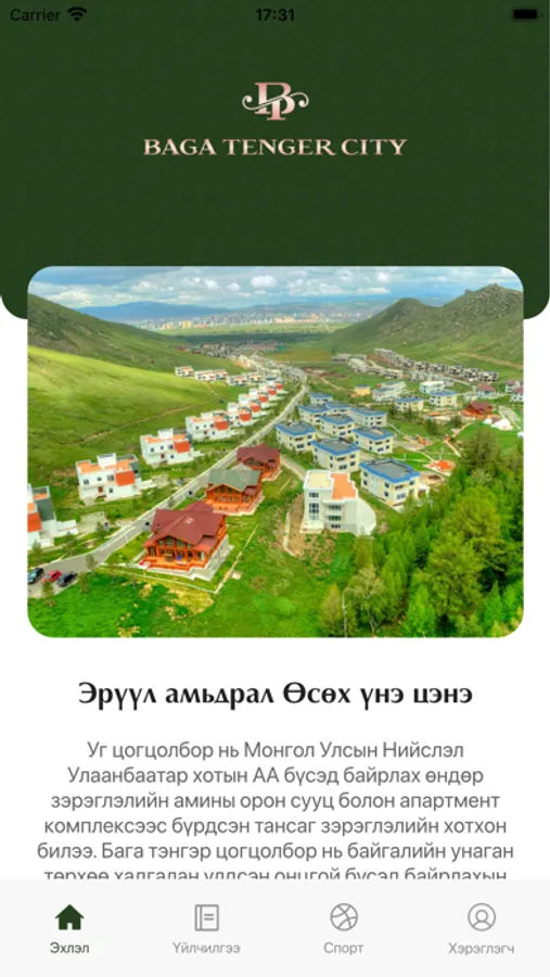 Baga Tenger City luxury serviced complex is located in an executive area of Ulaanbaatar, the capital city of Mongolia. This complex will make you feel embraced by nature yet it will offer modern luxurious lifestyle with swimming pool and resort style environment like no other.