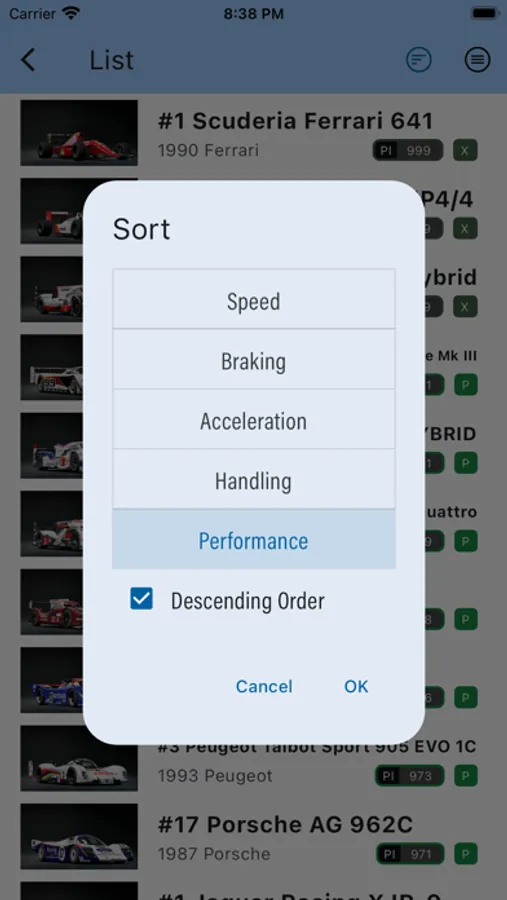 Supports sorting based on car parameters such as speed, performance, etc.