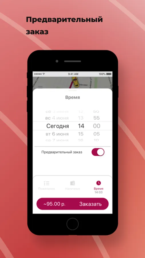 Выберите опцию “Предварительный заказ”. Поиск автомобиля начнется незадолго до заказа поездки, и автомобиль приедет к назначенному времени. Также вы будете заранее знать стоимость поездки.