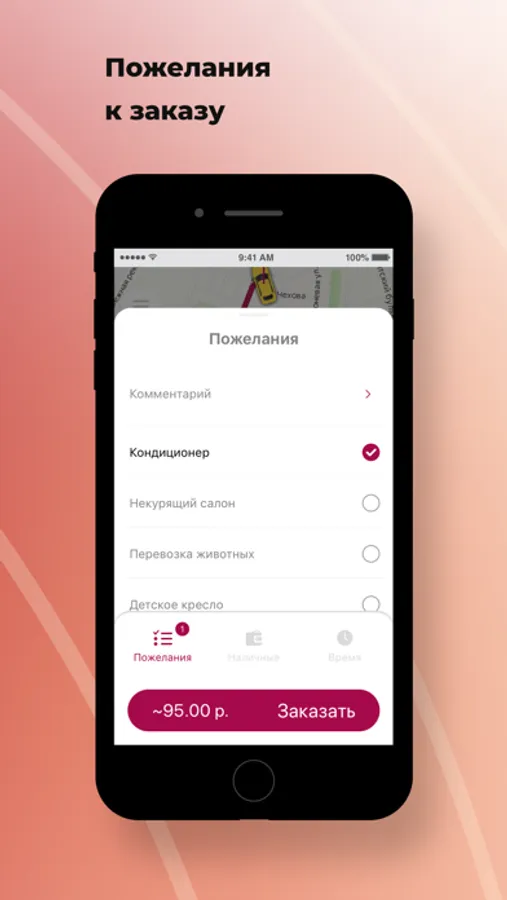 Добавьте к заказу дополнительные пожелания. Например, когда на улице +35 — выберите "кондиционер". Если вы не переносите запах табака — укажите "Некурящий салон", и к вам приедет некурящий водитель.
