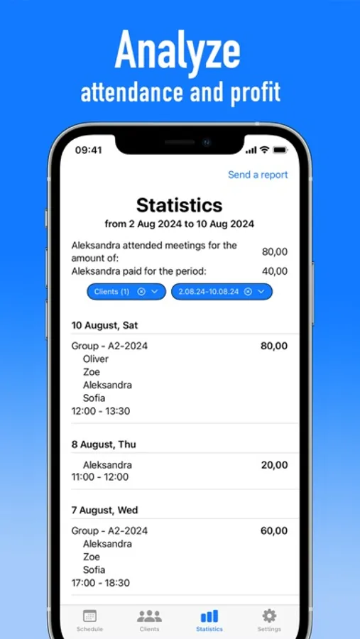 Generate reports on income, deductions, and attendance using the Statistics module with time and client filters.