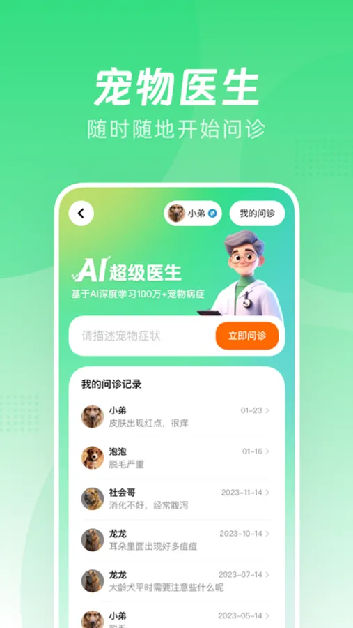 宠物AI医生:在应用中,我们引入了智能医疗助手可根据宠物的症状提供初步医疗建议。当您不确定宠物健康问题时,这将成为您的贴身专家。