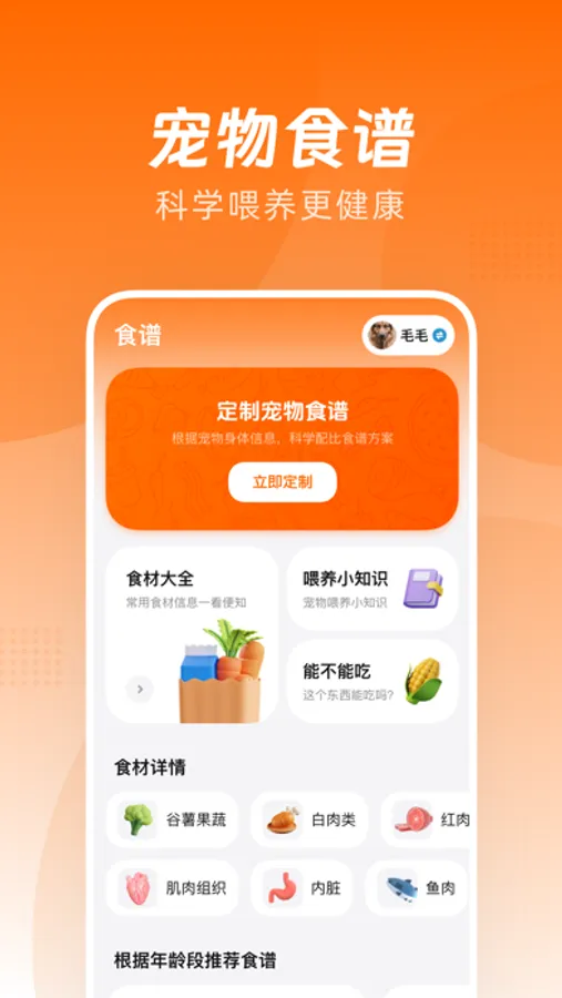 宠物食谱:通过宠爱,您可以轻松制定符合宠物需求的营养食谱。我们的食谱不仅美味,更关注宠物的健康为您的宠物提供超棒的饮食体验。