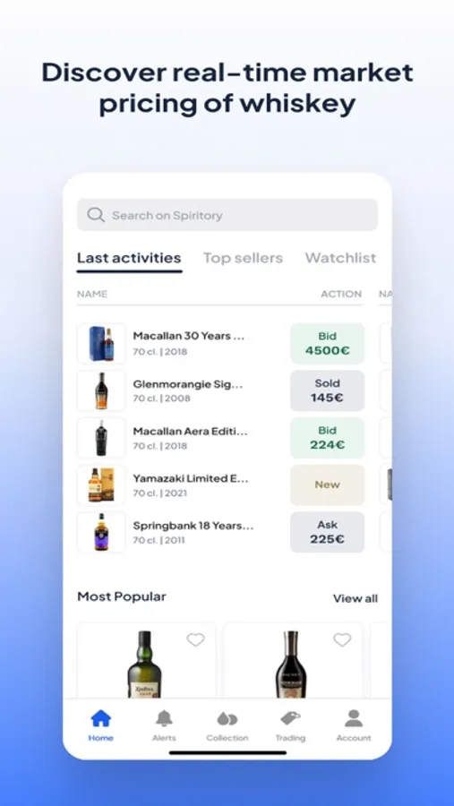 Spiritory is the fastest and safest way to discover, buy, and sell whisky, rum, cognac, wine, champagne, and other liquors. We even have the newest releases and limited editions of whiskies available including new Macallan, Springbank and Ardbeg. Using the Spiritory App, you can buy and sell in seconds - anywhere, anytime.