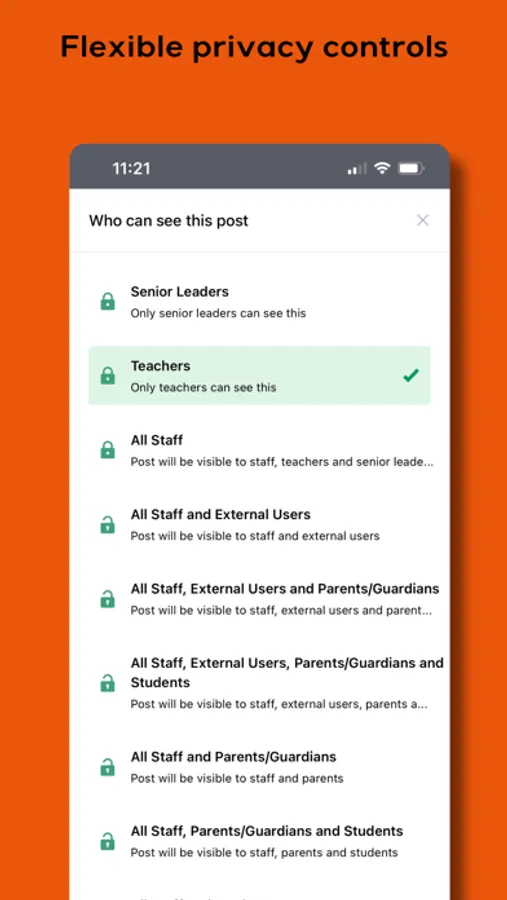 - Flexible, granular privacy controls, so that school staff, parents and students only access the right content.