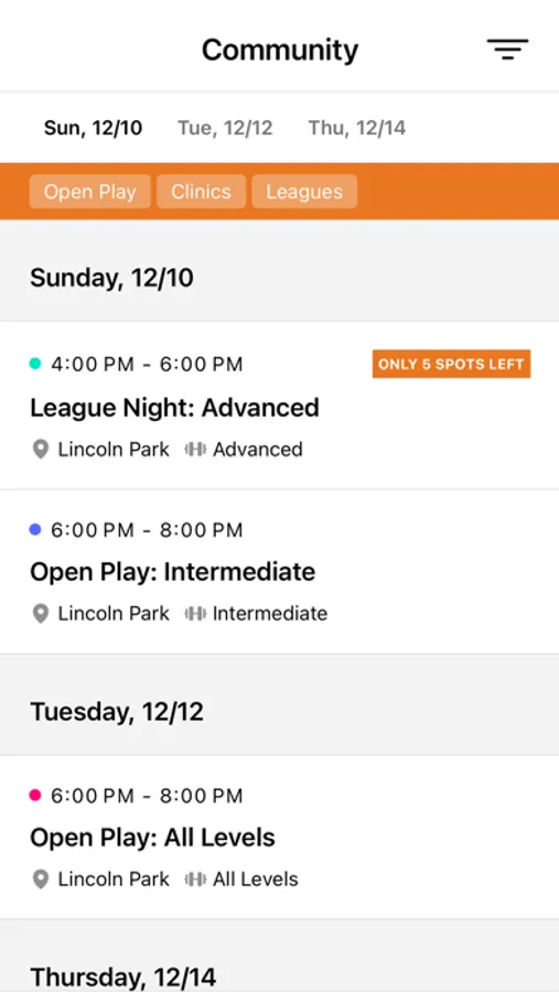◦ Join Open Plays or Leagues - weekly and monthly open play and league opportunities to meet people of similar skill levels.
