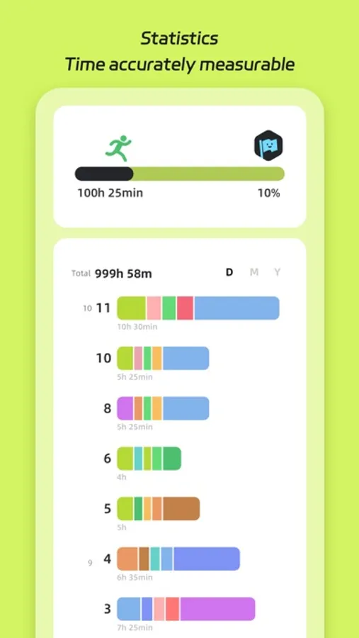 3. Data Statistics: Track your goal progress percentage and data for 3 dimensions (daily, monthly, yearly) across 12 tags. Gain clear insights into your goal and time investment. Adjust your time strategy when you identify issues with input and output.