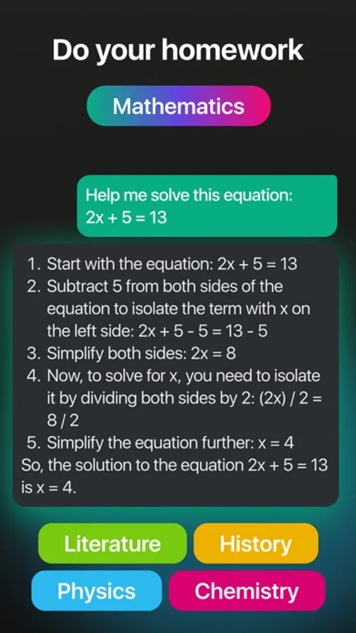Struggling with homework? AI chatbot can solve math, physics, and chemistry equations, write essays, and summarize the main ideas from books. Studying success has never been easier thanks to the power of GPT-4!