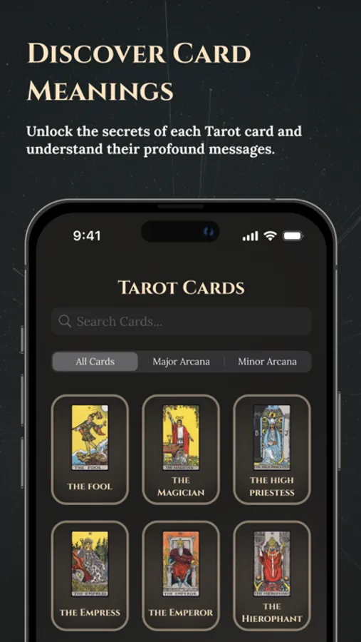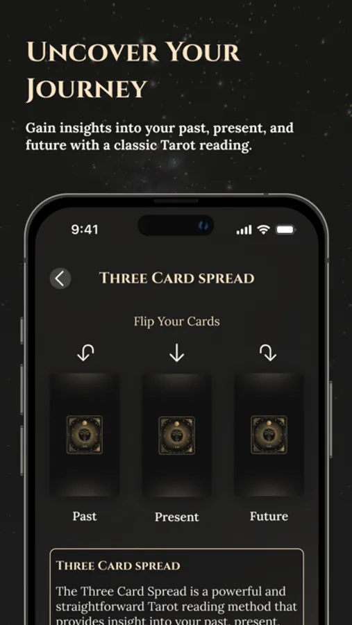 Our app is your trusted companion on your spiritual journey. Whether you're seeking answers to burning questions or simply curious about the Tarot, our app is here to guide you.