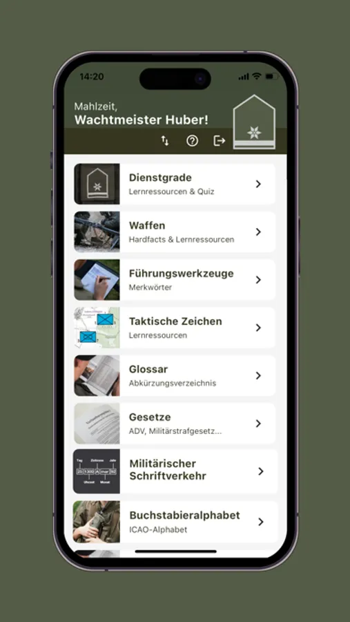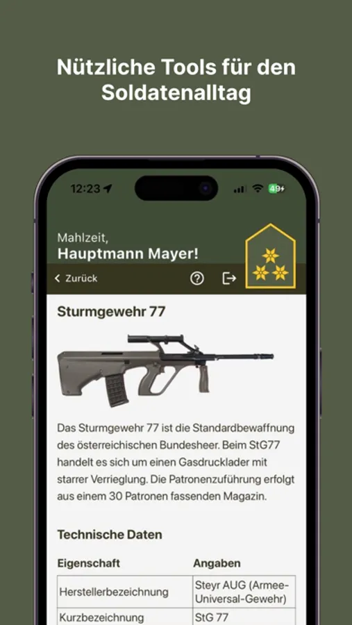Egal ob Informationen zu taktischen Symbolen, Ausrüstungspackliste, Dienstgraden, zum täglichen Dienst im Bundesheer oder das internationale Buchstabieralphabet - mit Appmarsch haben Sie viele hilfreiche Tools für das für das tägliche Soldatenleben stets zur Verfügung.