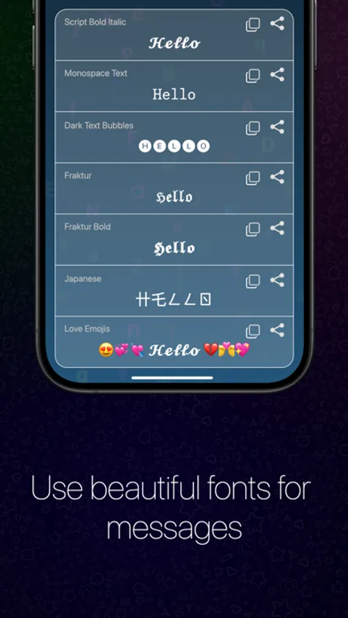 Don't want to waste time? Send results directly from the app to your favorite messengers and surprise friends with unique text creations.
