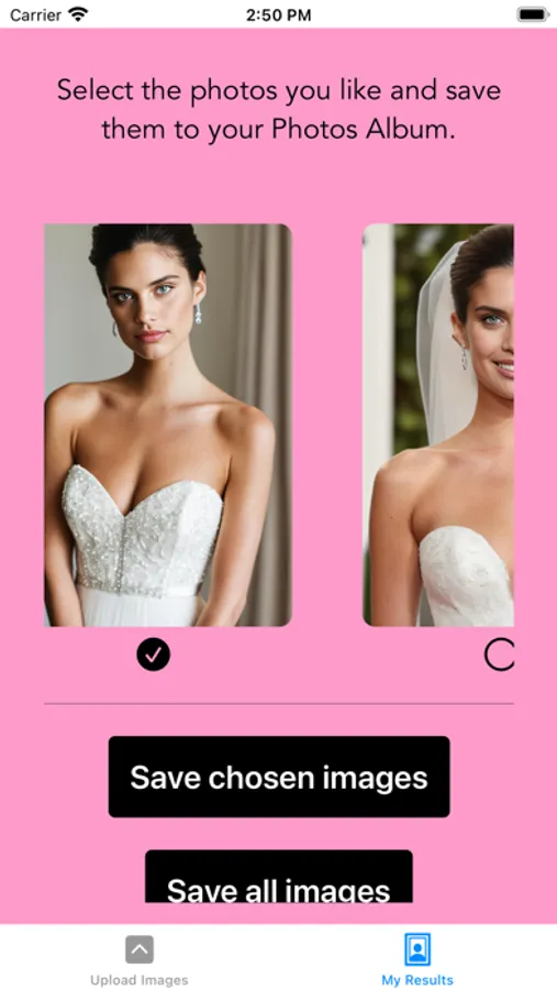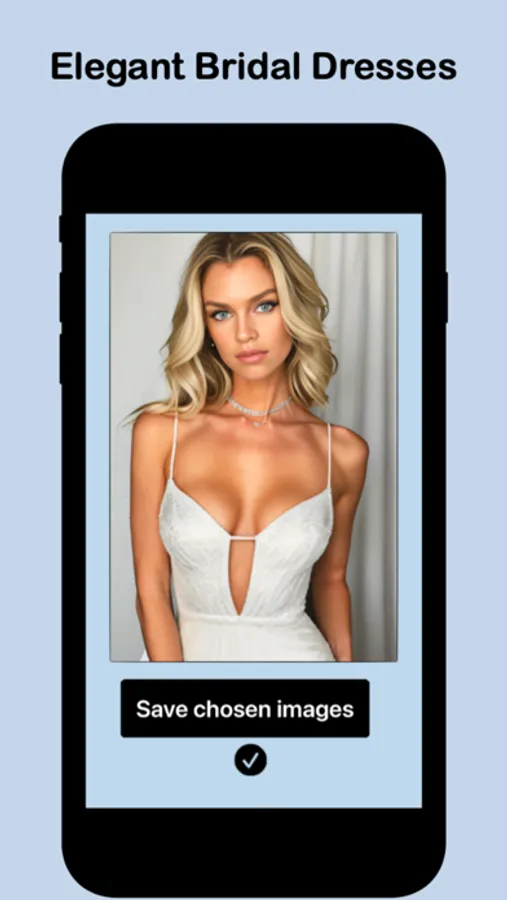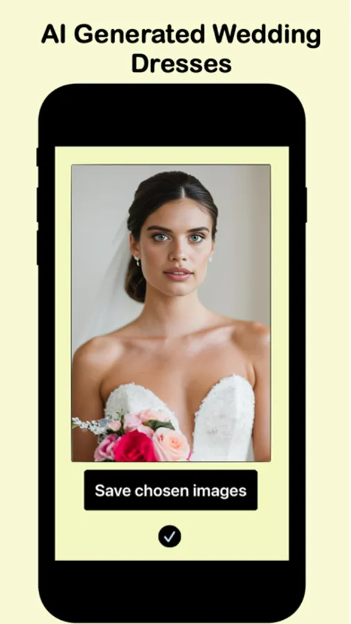 The process is simple. Just upload 10-30 selfies of yourself, making sure you follow the guidelines for best quality, and after 30 minutes we'll deliver wedding pictures with your face straight to your phone. You can choose which photos to download.
