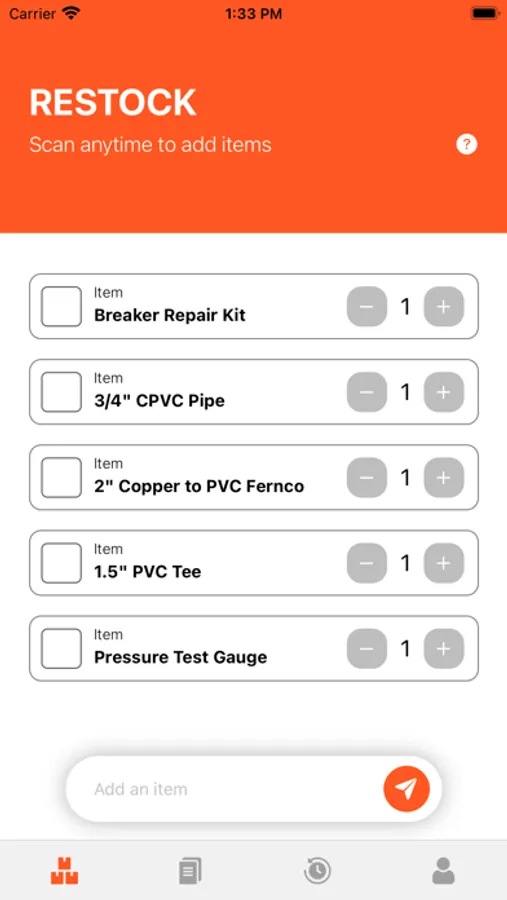 *Barcodes* You can print off barcodes with randomly generated UPC numbers from our website or directly use the barcode on an item’s packaging! *On The Job* simply scan an item’s barcode to remove it from current inventory, no taps or clicks required! When you’re ready, use the ‘Restock’ page to review needed inventory. Your inventory and restocking needs will be synced between devices to make collaboration easy.