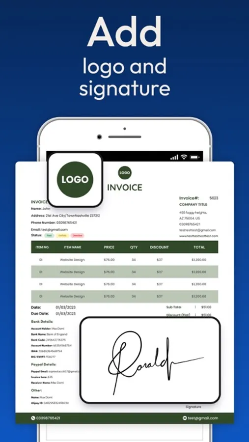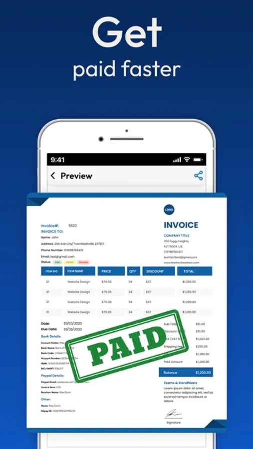 Include payment options like PayPal, COD, or bank transfer details, making it easier for clients to settle their bills. You can also mark invoices as paid/unpaid/overdue.