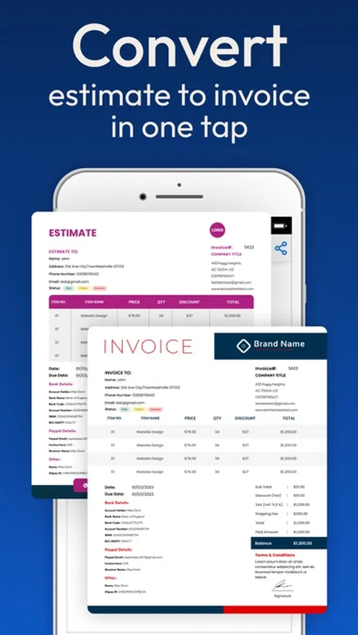 This Invoice Creator- Receipt Maker comes with multiple pre-designed invoice templates that can be easily customized and edited. To create an invoice and estimate just add important information related to the invoice or estimate, select the template, sign the document, and send it to the concerned party.