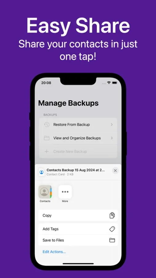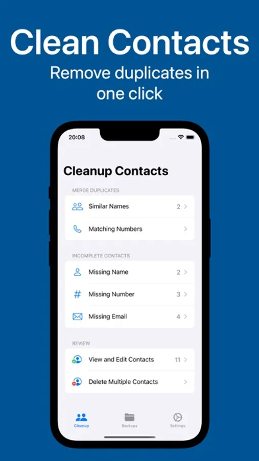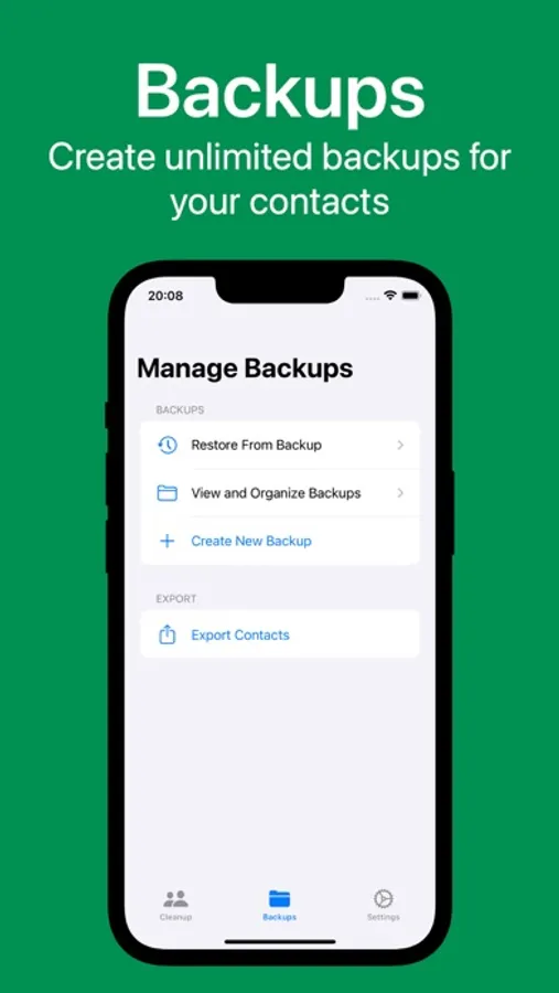 Backup & Restore: Safely backup your entire address book before making changes. Restore with one tap.