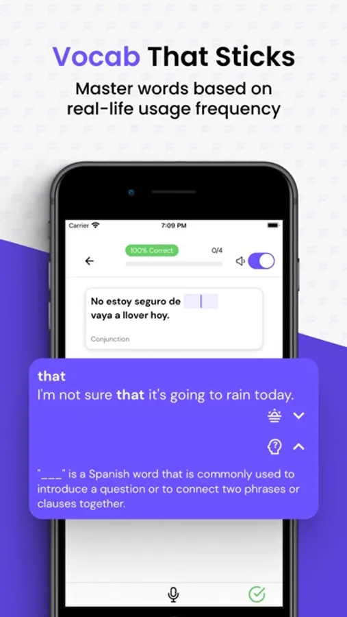 Vocabulary Mastery: Embrace the power of the popular Anki style spaced repetition with our flashcards, designed for long-term word retention. Experience the benefits of contextual learning, a method celebrated for its effectiveness in language acquisition. Our vocabulary words are sourced from millions of hours of Spanish television. They are then sorted and shown to you in order of how frequently they are seen in real life. This means that you learn the words you need in the order you need them.