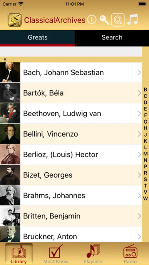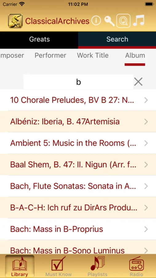 2) Must Know: (By Composer -or- by Period & Genre) which is a list selected by our musicologists of the ~800 most important works of classical music you'll want to be familiar with. Selecting a work will always play the performance from the latest release (as opposed to The Library where you can select the performance.)
