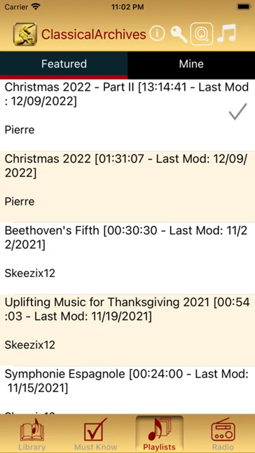3) Playlists: (Featured and Mine) allows you to listen to featured playlists or to create, and listen to, your own. Up to 12 hour-long playlists are allowed. Subscriber account at Classical Archives is required.