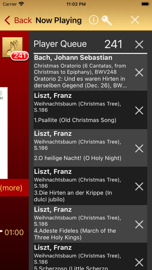 This app offers a queuing player (click the [Q] icon at the top to view/edit it): you may enter a complete symphony plus a full opera if you wish. You may add several works and tracks to the player only as long as the current queue does not already contain 20 or more tracks. Each time a track is played, it is removed from the queue and the count goes down. The queue can be edited (remove a track by clicking the 'X' next to it) and it allows you to jump to and immediately play any track in it