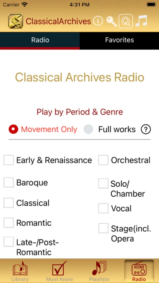 4) Radio: Our radio will continuously stream either a series of single movements, or complete works (depending on your choice) that will be pulled from the selection of Period(s) and Genre(s) you select, from Early & Renaissance to Modern/Contemporary -- in the following genres, or combination of genres: from Orchestral, Solo/Chamber, Vocal, and/or Stage (incl. Operas). The radio will continuously refill the queue, until you stop the player.