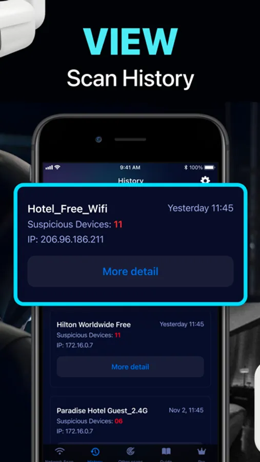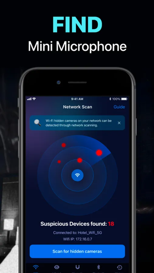 This app allows you to detect suspicious surveillance devices—such as unauthorized cameras, audio bugs, listening tools, or other covert equipment—in hotels, Airbnbs, vacation rentals, shared spaces, or any place that feels unfamiliar.