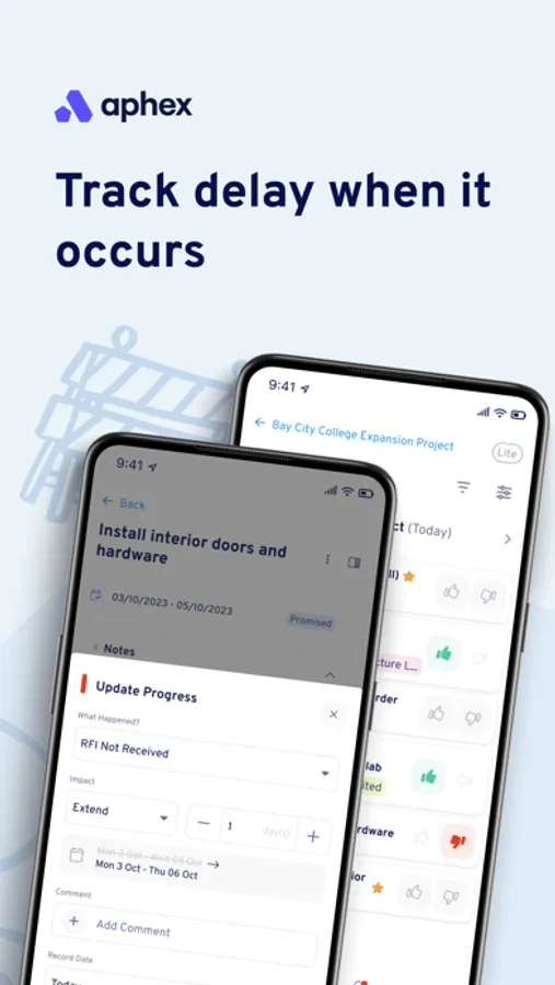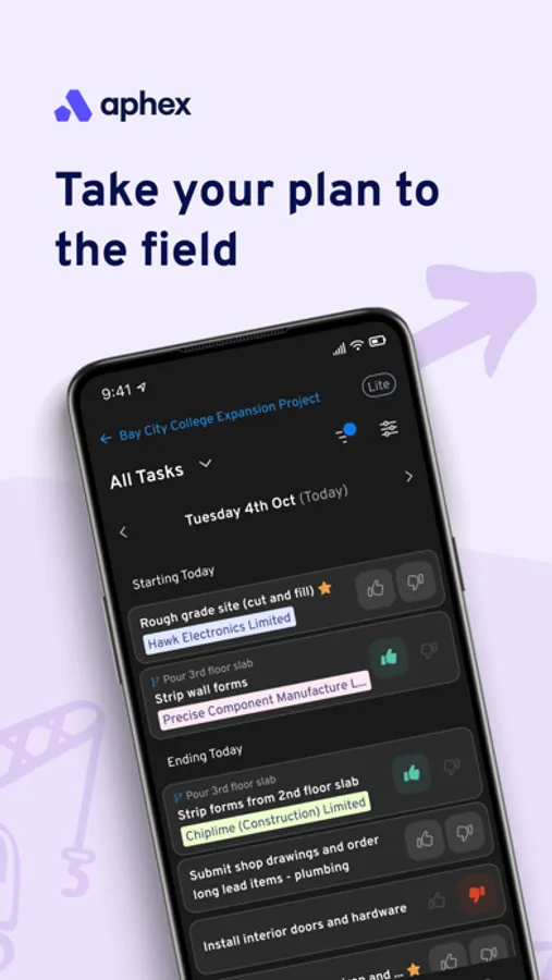Aphex gives construction delivery teams on-the-go access to live, daily work plans right from their phone or tablet. Stay in the loop with real-time updates between the office and the site. Easily view your tasks, log delays, improvements, and explore the plan on the interactive map.