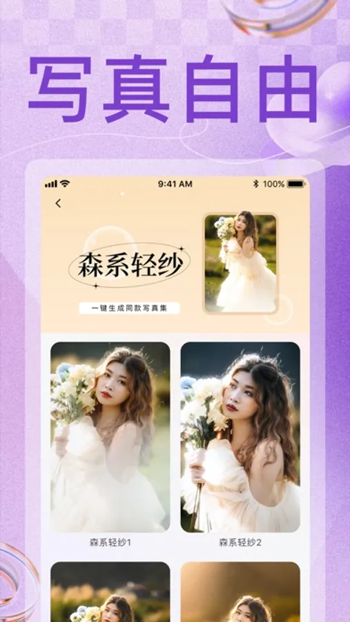 写真相机支持一键生成精致个人形象及写真照片,让你轻松拥有一份个人写真照片集。海量模板任你挑选,不论是通用证件照、韩系证件照、港风、夏日少女、芭蕾风、还是气质婚纱等,统统一键拥有,让你展现百变风格的自己!