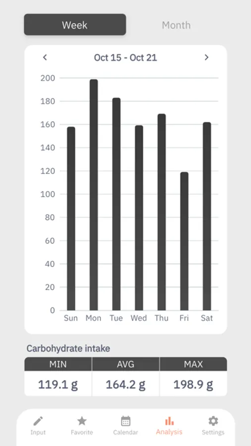 On the "Analysis" screen, you can view your weekly and monthly carbohydrate intake through charts,, which is useful when reviewing your dietary habits.
