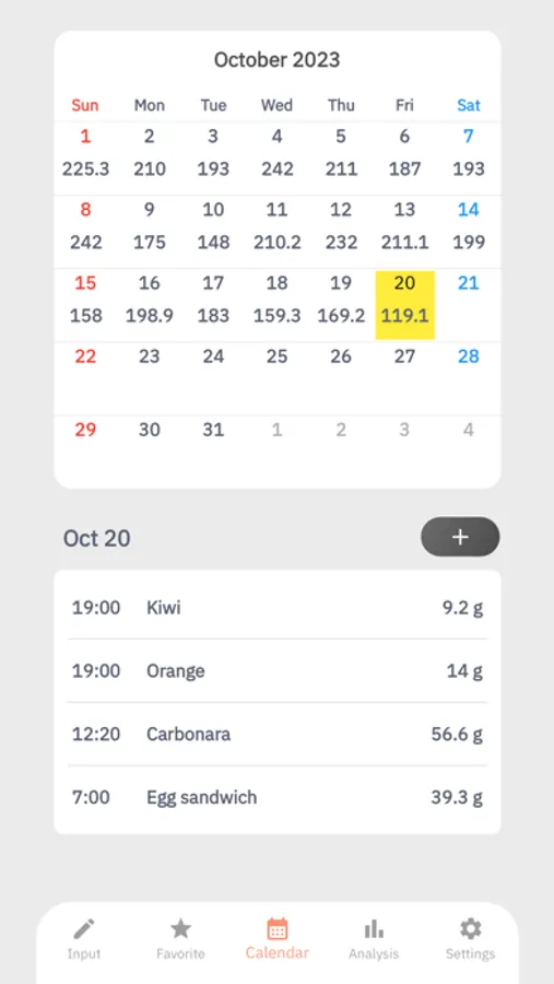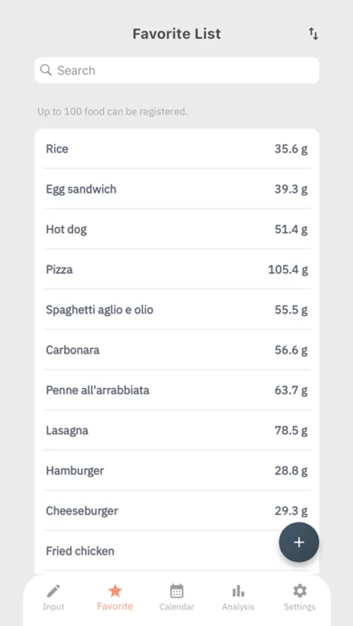 By registering the food name and carbohydrate amount in the “Favorite List," you can easily select them from the list for future entry.