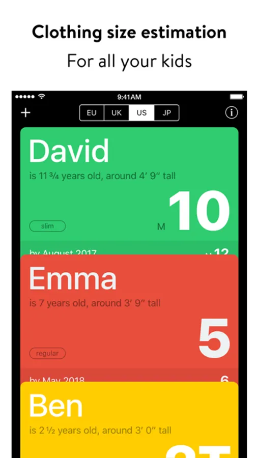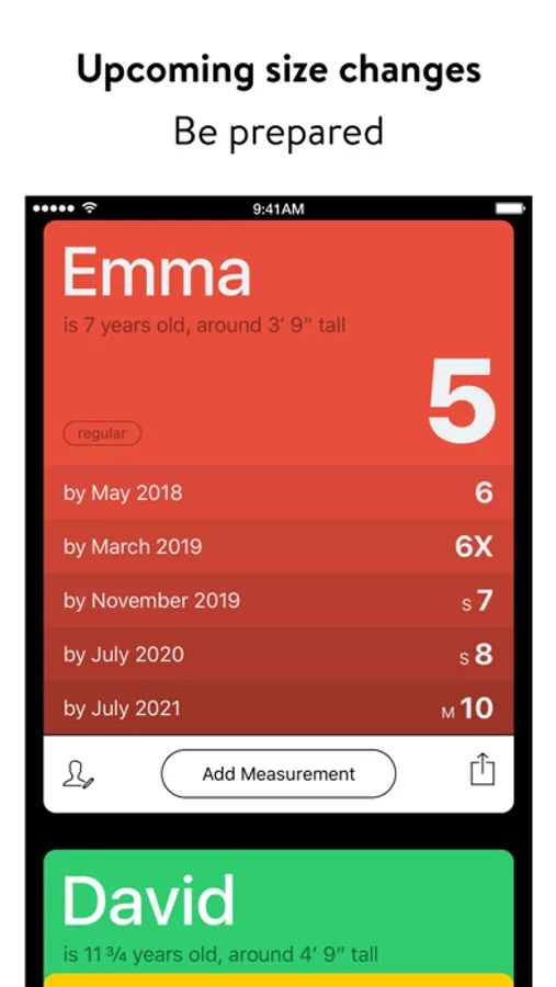 • »Next Size – Kids Clothing« will show you immediately which clothing size fits right now¹ and when the next ones will fit².
