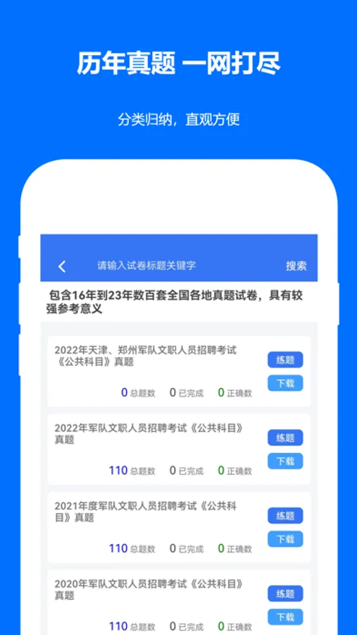 军队文职备考,考试之路充满挑战。在这充满荆棘的征程上,我们的真题将是你的强大助手。每月时政、章节练习、历年真题,无一不为你备战全面提供支持。高频题目精选,智能测验助你精进。特有错题巩固功能,消除考试路上的顽固障碍。名师解析助力你攻克难关。不要止步,与我们一同前行,军队文职考试的成功路上,军队文职真题是你坚实的后盾。无论多困难,我们都将陪伴你前行,因为考试,我们同在!