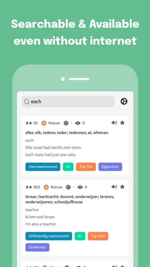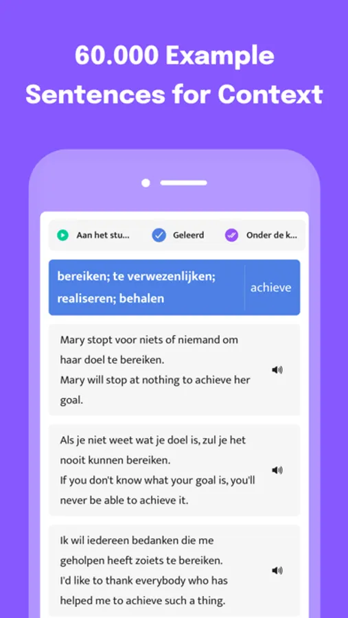 Master Dutch effortlessly with 3k essential vocabulary words, over 100k example sentences, hands-free learning, quizzes, spaced repetition, sync, dictionary, and notifications
