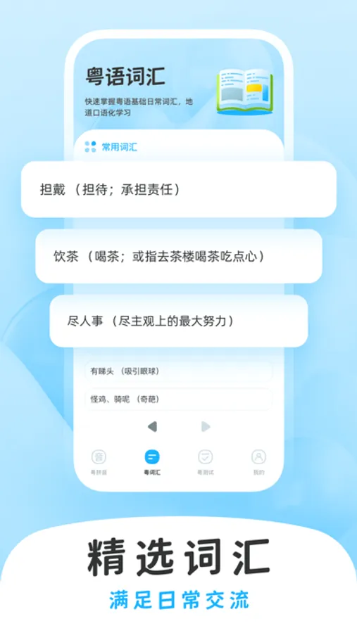 3、粤语词汇课后测试题,配套词汇测试习题,学后及时巩固,提高粤语水平,地道广东话助你流利说粤语。
