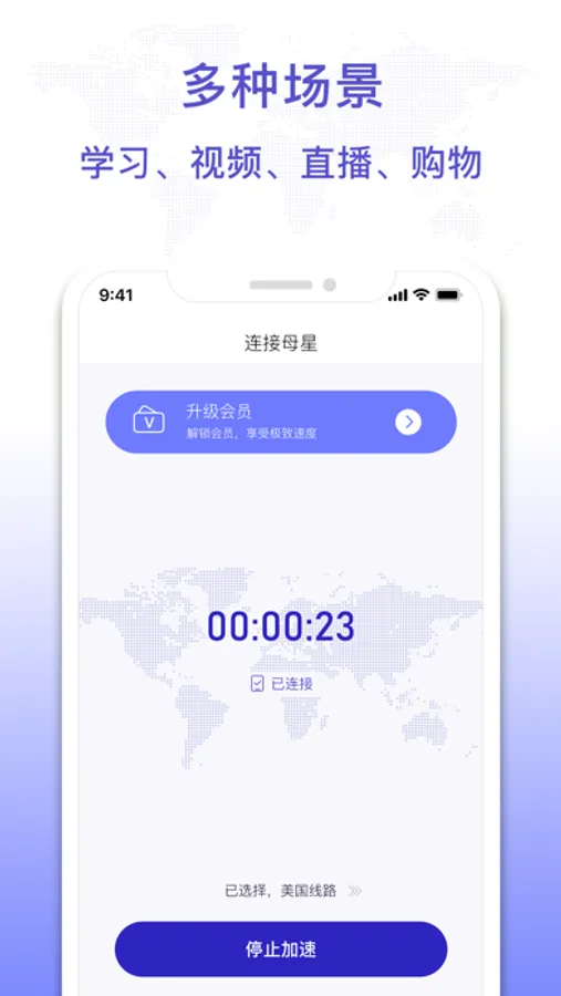 全场景:支持网站/在线游戏/音乐服务/直播/高清影视/学习/视频直播/购物等全场景网络进行优化加速,能降低网络延迟和减少卡顿